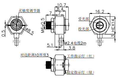 業界最小調制式柱形漫反射傳感器,放大器內藏型,可替代光纖傳感器,線纜隨意折彎,使用更放心! 抗強光,抗干擾。